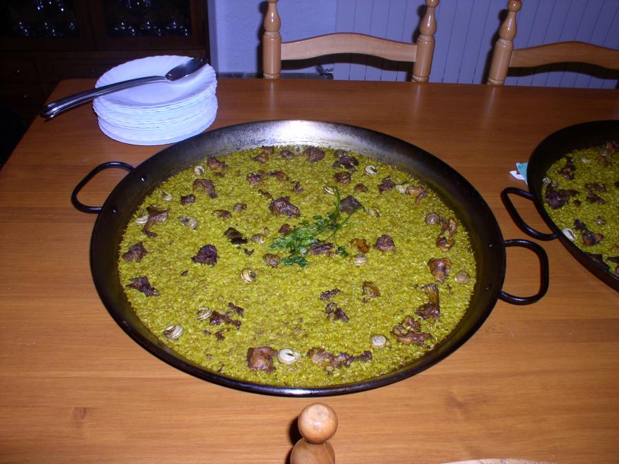 Po náročném programu jsme se přemístili do restaurace Casa Montaña, kde následovala hostina ve španělském stylu. Předloženo bylo několikero druhů předkrmů v podobě rozličných plodů moře, loupaných rajčat naložených v oleji, typické sušené šunky, oliv a sýrů, ke kterým bylo rozléváno svěží suché bílé víno z D.O. Valencia. Dále byla podávána bramborová kaše s česnekem, fazole s aromatickým kořením, čtvrtky brambor s velmi ostrou omáčkou tapas, smažené zelenino-rybí karbenátky, papričky plněné rybí pomazánkou, krvavé jehněčí kostečky s cibulí a na plátky nakrájené kalamáry, s nimiž jsme volně kombinovali červená vína Santa Rosa, reserva,